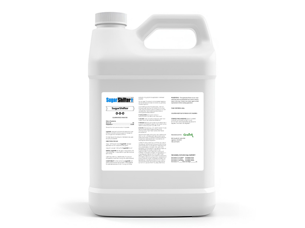 SugarShifter is a targeted micronutrient solution designed to improve sugar movement inside the plant and support reproductive performance. SugarShifter helps ensure carbohydrates produced in the leaves are efficiently moved to growing points, flowers, and grain. SugarShifter is commonly used to support pollination, improve grain fill, and enhance nitrogen efficiency, helping crops maintain performance during key reproductive growth stages.